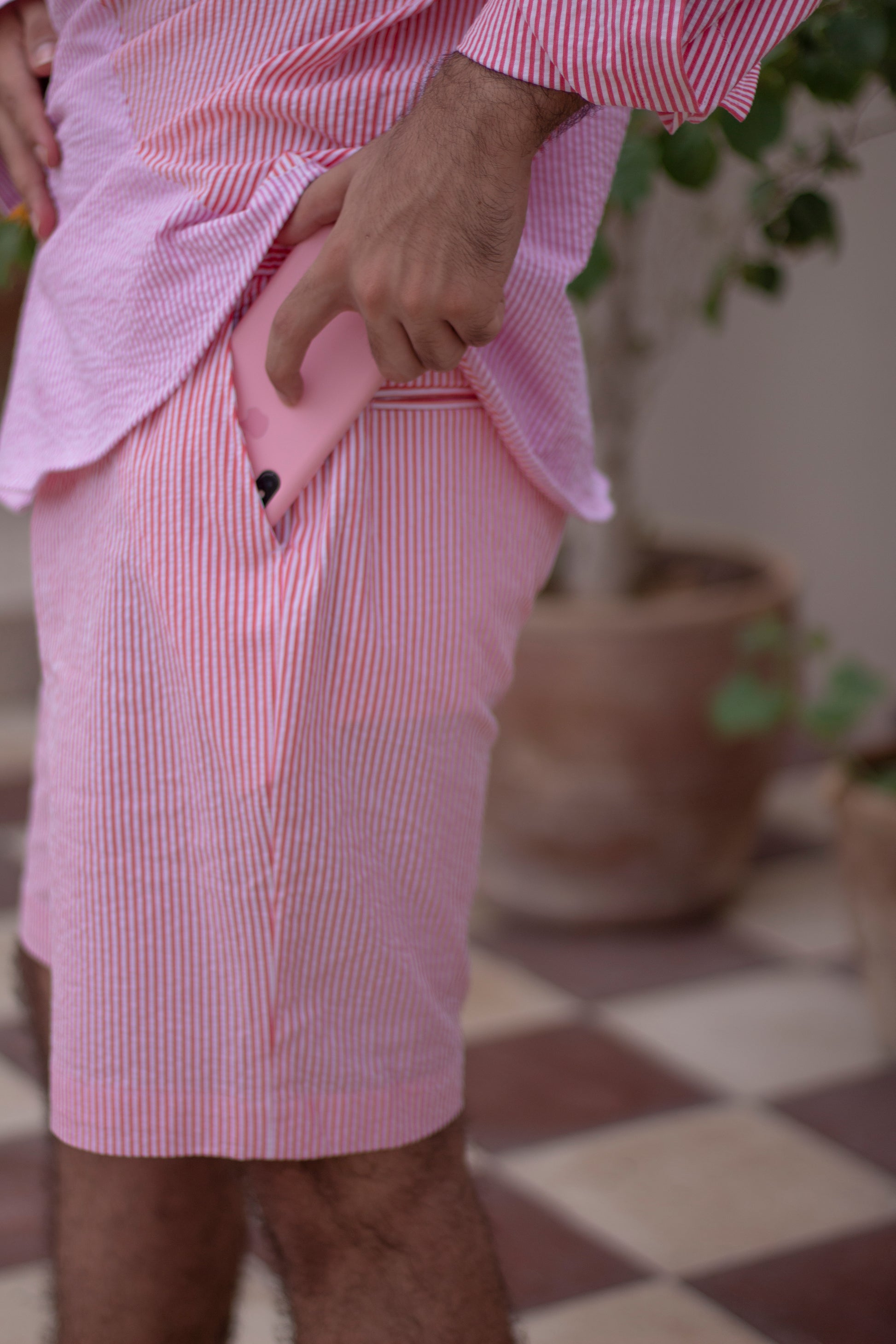 Our shorts are crafted from lightweight, textured seersucker cotton for a breathable, easygoing feel. Available in Midnight, Blue Stripe, and Red Stripe, each pair features an elasticated waistband and adjustable drawstring for a secure, comfortable fit. Designed to keep you cool and polished, they’re a warm-weather staple that pairs effortlessly with casual or tailored pieces.