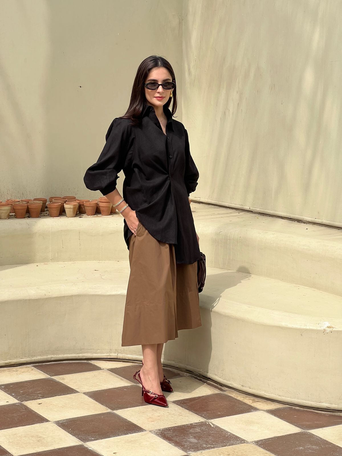 This button-down shirt features pleats on both the shoulder and the cuffs. An unexpected side button allows you to transform the shirt into an asymmetrical top, offering a fun twist to your wardrobe.